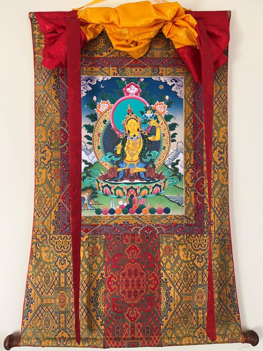 Sherab Chamma Thangka with beautiful gold brocade w/ red.